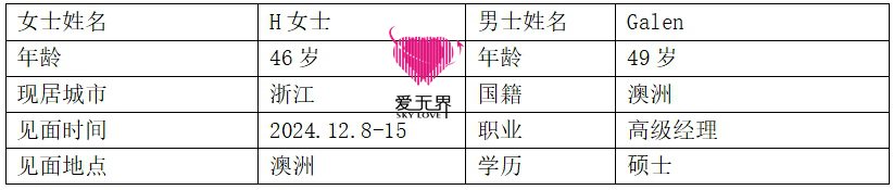 Galen是年龄49岁的澳洲绅士,曾为中国几家上市公司提供咨询服务,对国企很熟悉,因此对H女士在国内事业上的成就深感钦佩。他希望寻觅一位教育背景、认知层面与自己相契合的灵魂伴侣,而H女士的学历、工作与见解,无一不契合他心中的标准。