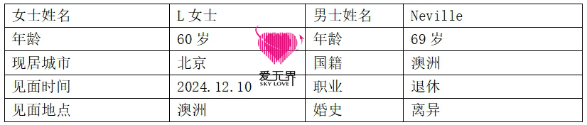 60岁的L女士来自北京,是一位高价值的女士,内心丰盈。澳洲的Neville69岁,已经悠然退休,享受生活。