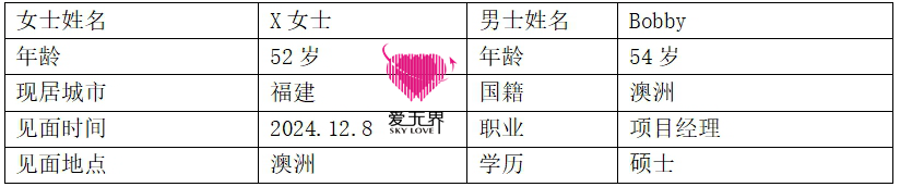 澳洲的Bobby先生,54岁,拥有硕士学历,是一位经验丰富的项目经理。在初次交流中,他就对X女士展现出了浓厚的兴趣与热情,甚至还有些忐忑,担心自己是否能赢得女士的青睐。