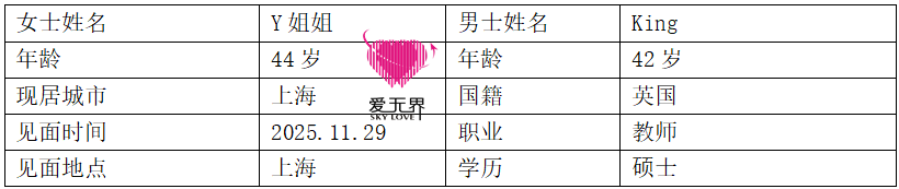 上海的Y姐姐44岁,性格开朗,爱说爱笑,喜欢烘焙,整个人充满活力!和她见面的英国男士King,42岁,也是个阳光开朗的人,说话总带着笑意,热爱美食与旅行,甚至能下厨做几道不错的中国菜。